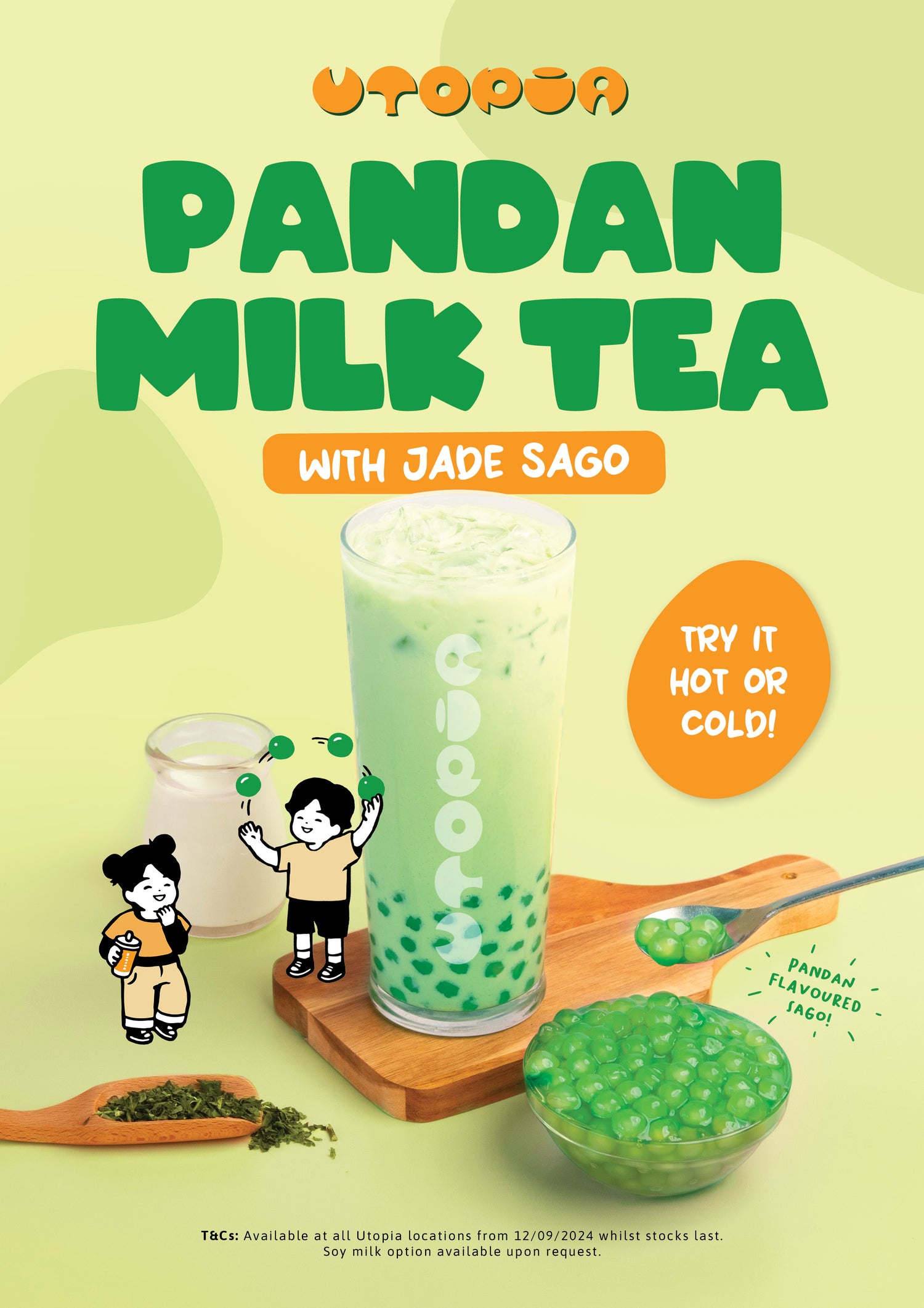 Dive into pandan paradise with our newest milk tea! Sweet, fragrant, and creamy, this treat is available hot or cold. Plus, it’s topped with Jade Sago (pandan flavoured sago) for extra pandan goodness.