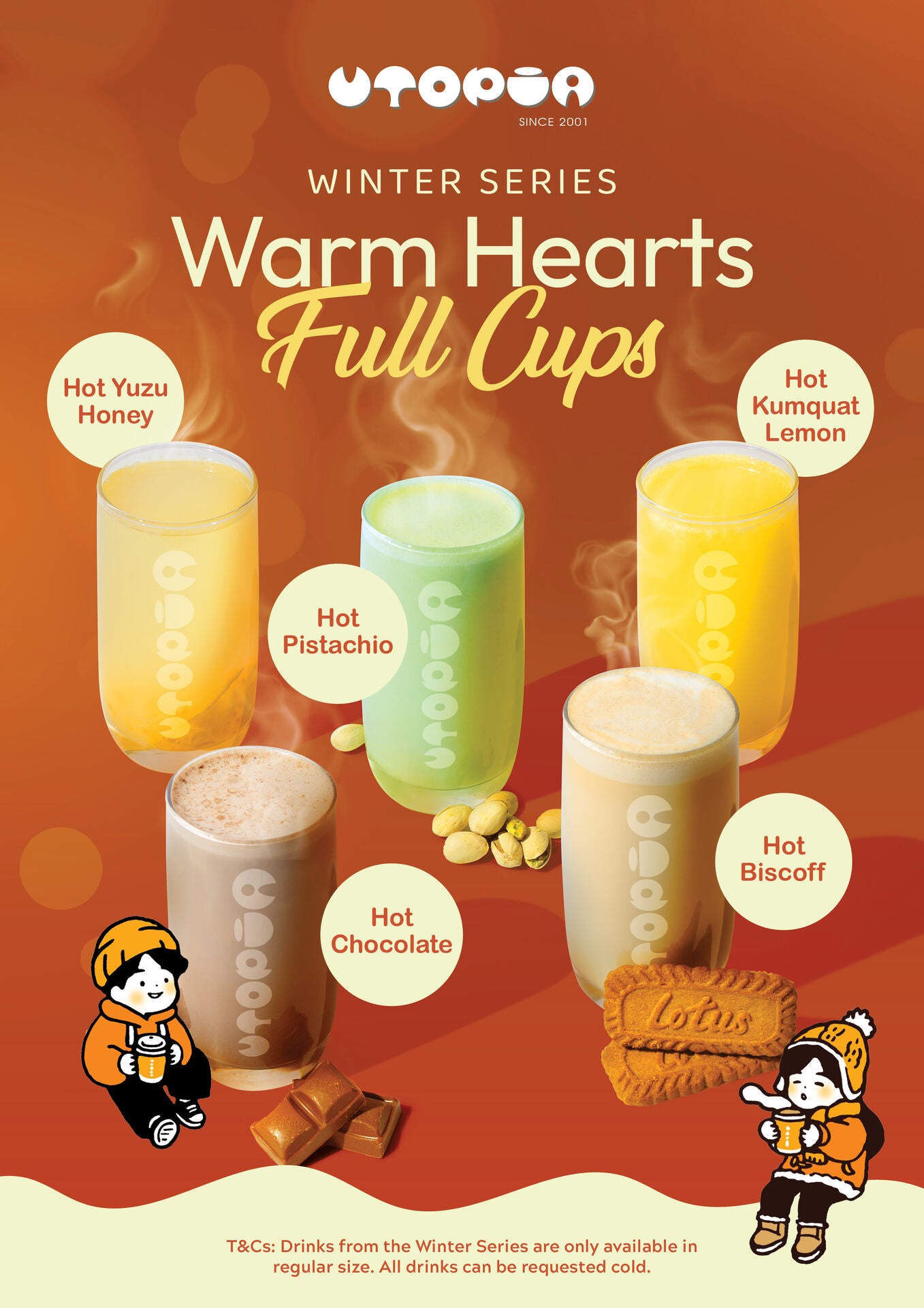 Choose from Hot Biscoff, Pistachio, Chocolate, Honey Yuzu, and Lemon kumquat. Comfort in a cup, to combat cold weather. Get your mitts on one today!